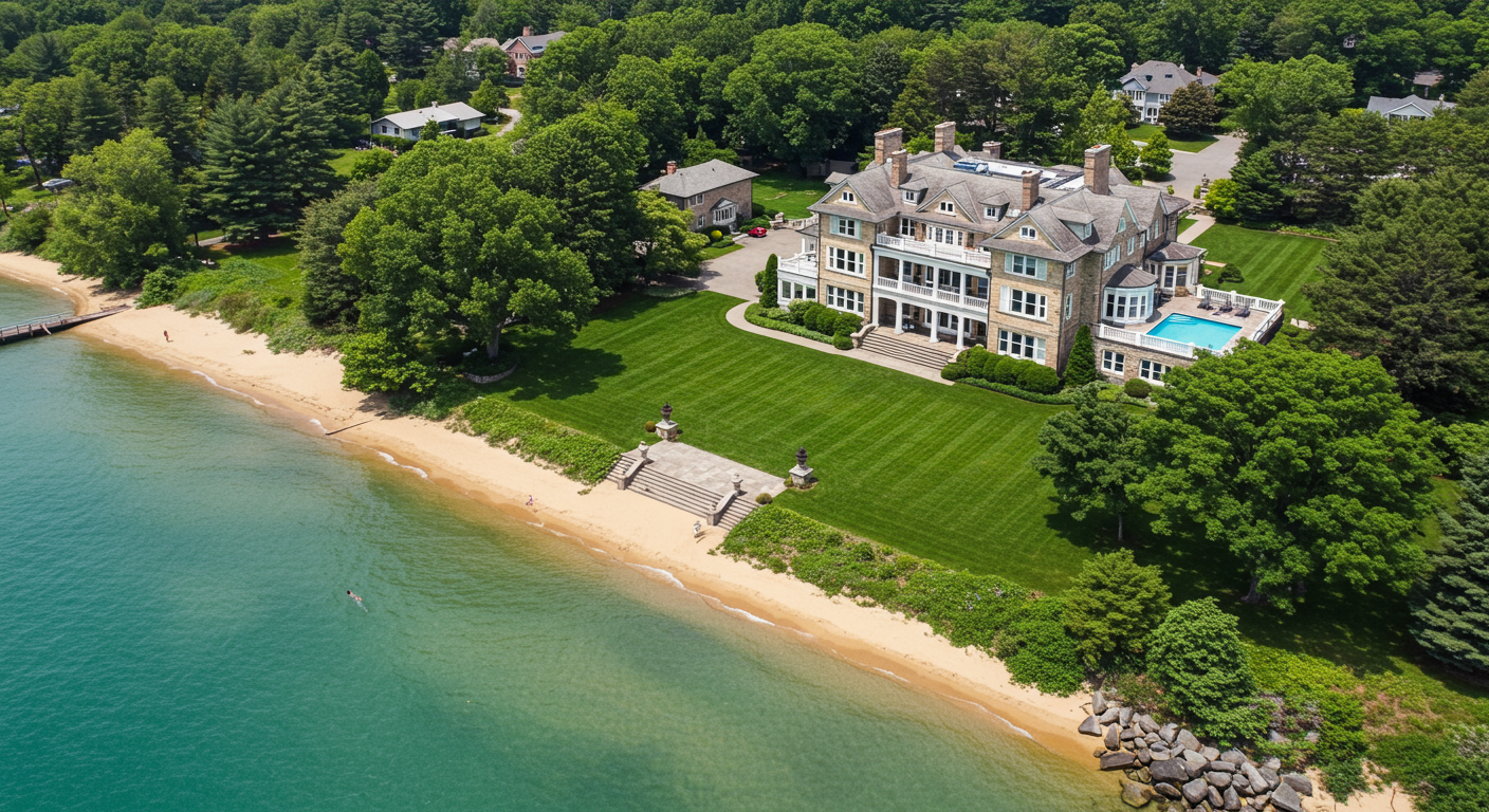 The Egandale house has 15 rooms, and on the property are an outdoor swimming pool, an electric tram down the lake bluff, and 110 feet of beach.