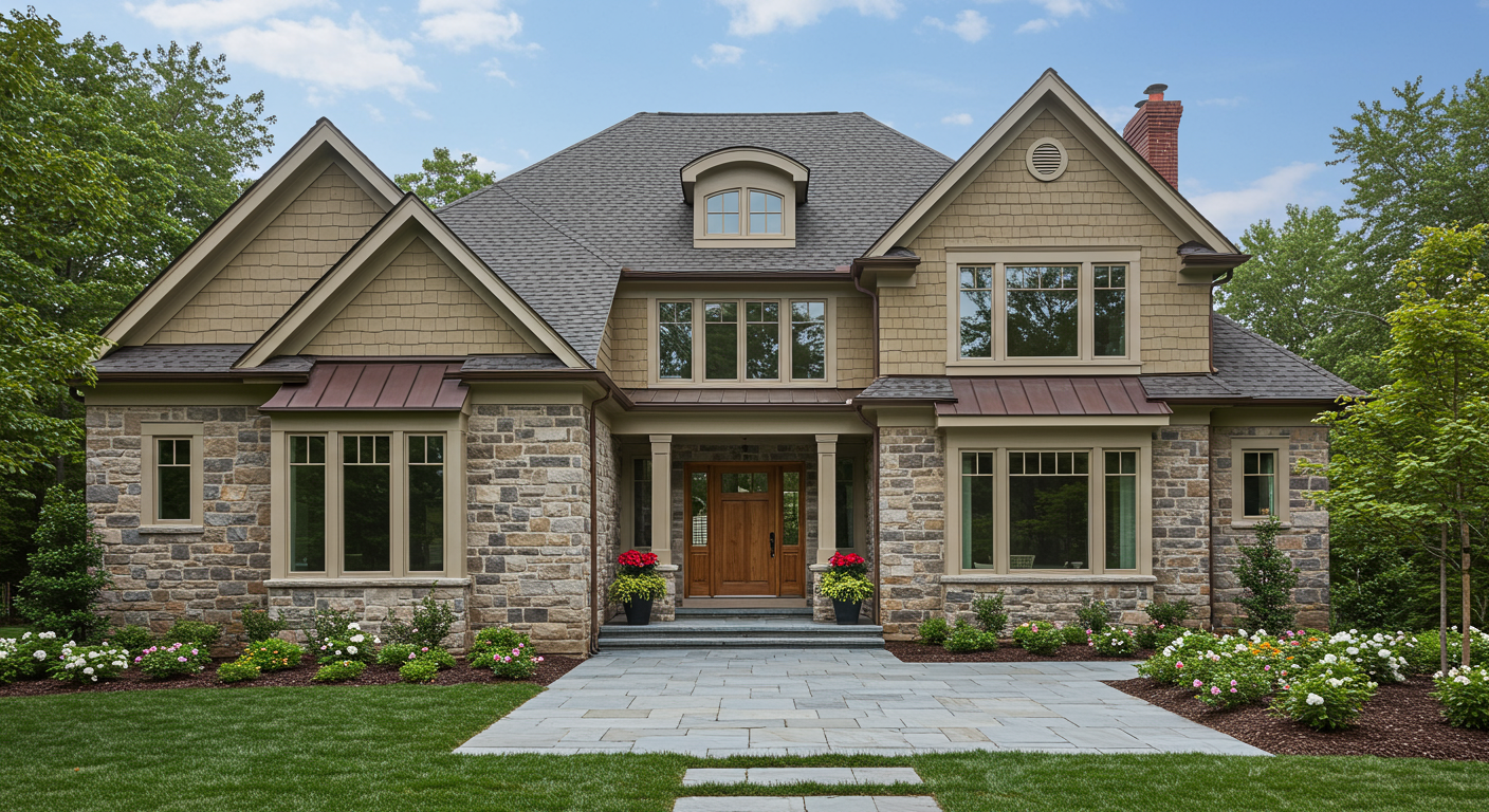 Behind the multi-hued stone, facades is a living room and dining room with tall windows and extensive millwork, a crisp white kitchen with a sunny breakfast room attached, and a wood-wrapped office with a fireplace. In the basement are a glass-walled wine room, a movie room, and a bar area, and the home also has an indoor half-court basketball gym and separate workout room.
