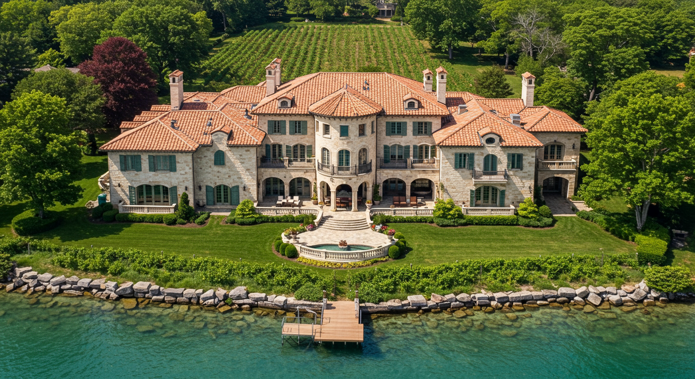 The Italian-style villa features its own vineyard and nearly 700 feet of Lake Michigan frontage
