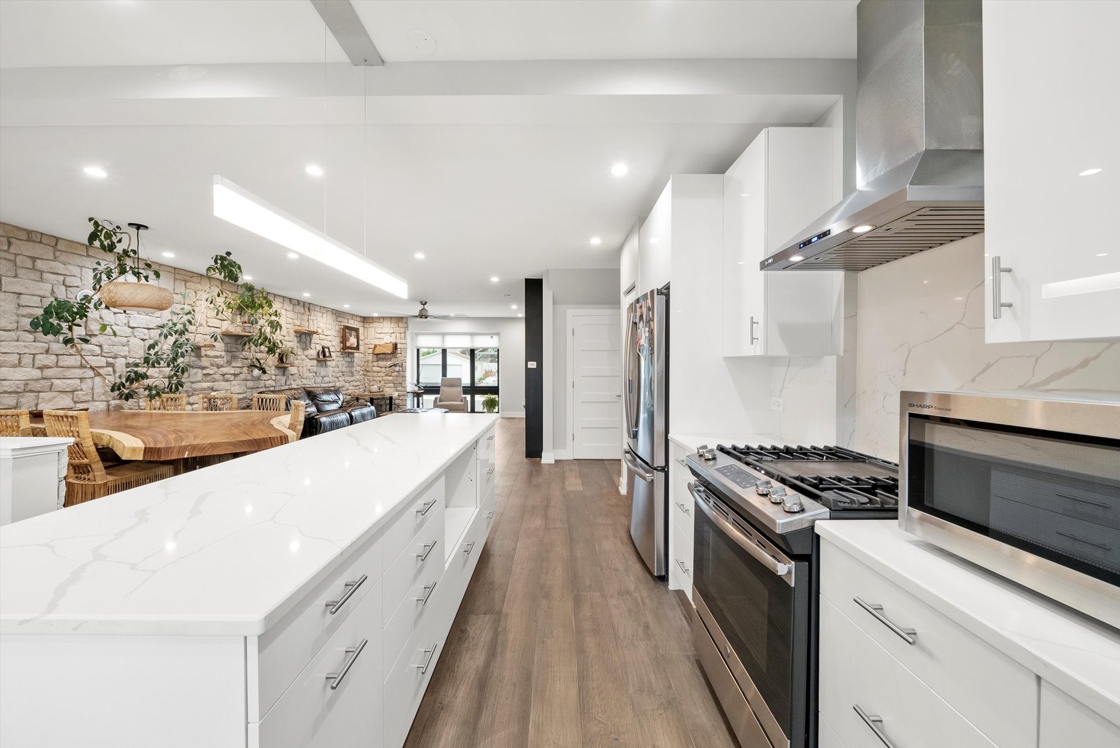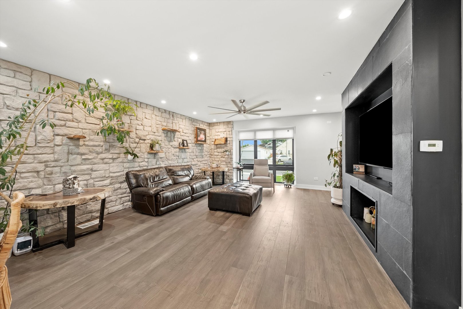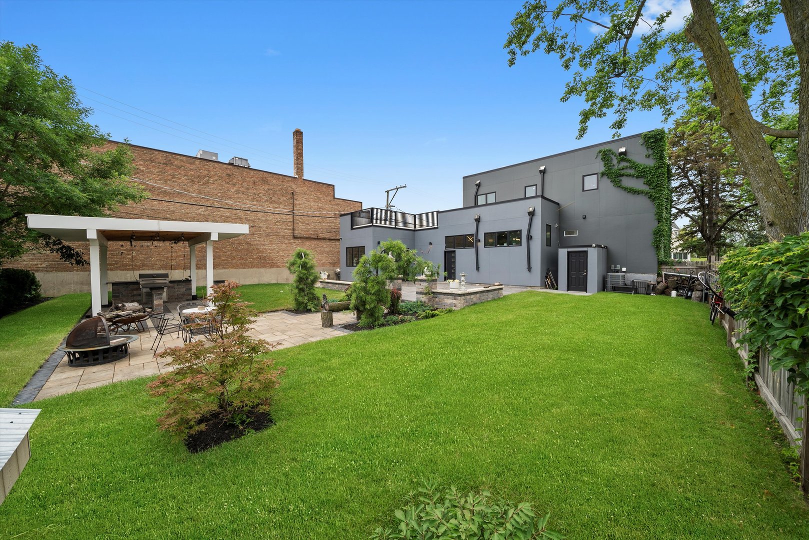 Welcome to 9 N. Lavergne Ave in Northlake - a stunning completely rebuilt new construction home offering contemporary design and exceptional features throughout. This spacious residence features 4 bedrooms, 4 full bathrooms, a versatile loft area, and an open-concept layout ideal for modern living. The main living space showcases a sleek stone accent wall, abundant natural light, and a large kitchen with quartz countertops, custom cabinetry, and plenty of workspace. The attached 4+ car garage provides ample storage and convenience. Enjoy premium amenities including built-in surround sound on three levels (including the backyard), a private fenced yard, multiple patios, gazebo, and built-in grill - perfect for entertaining. The full basement is ready for your finishing touches. Located in a desirable area with easy access to schools, parks, and major expressways, this home combines luxury, space, and function in one exceptional package.